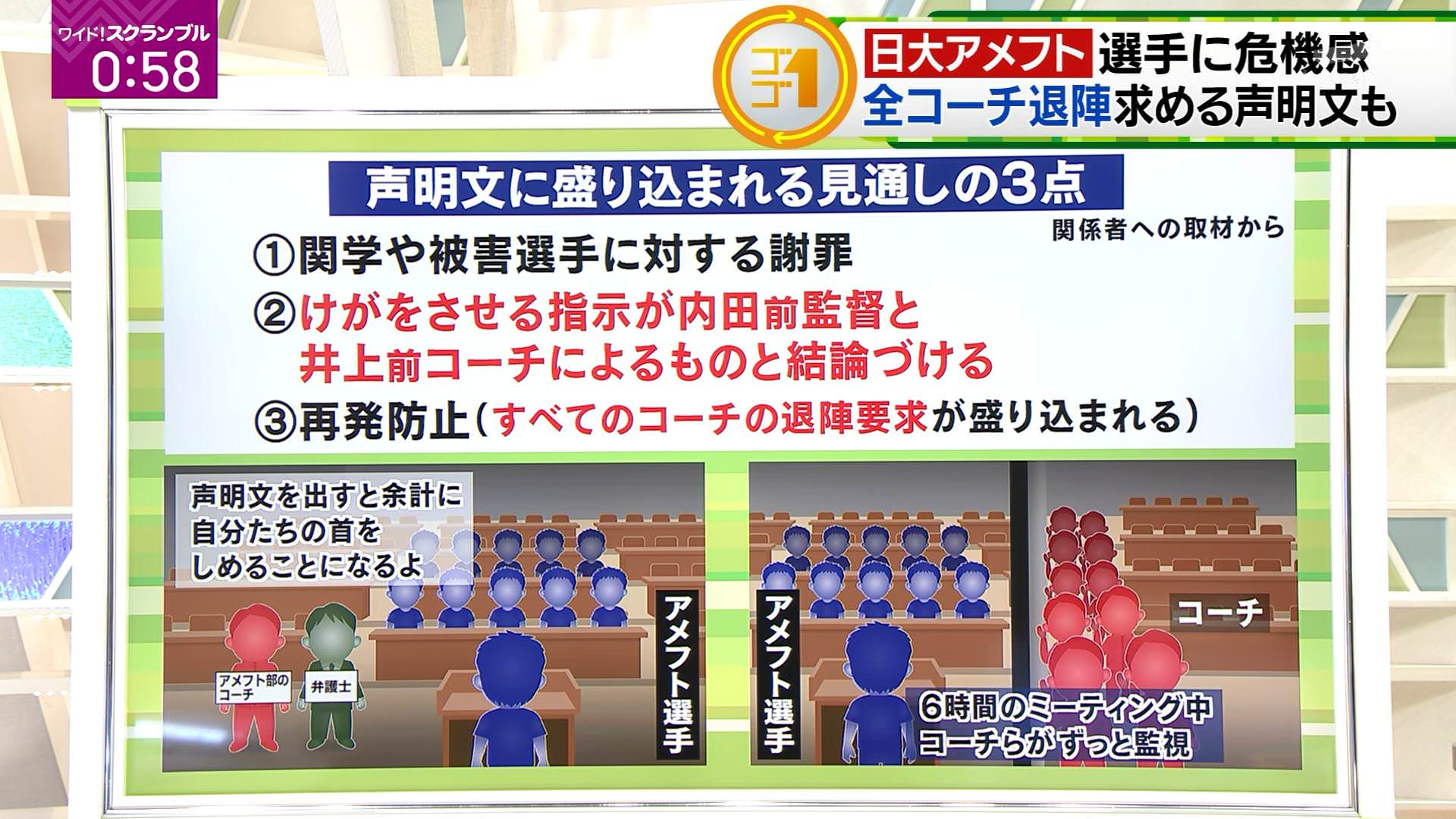 ・日大アメフト部員たちが全コーチ退陣を要求する声明文を近日発表するという