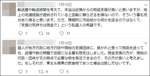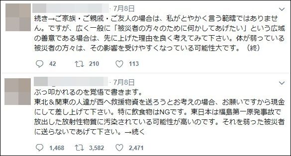 致し方ないです」と説明した。「積極的に汚染地から何かを送るのではなくて、『支援の気持ちは現金で』という私個人の希望です」。女性は自身への意見や批判に対して懸命にツイートしたが、コメント数が膨大であるため、途中で断念したという。