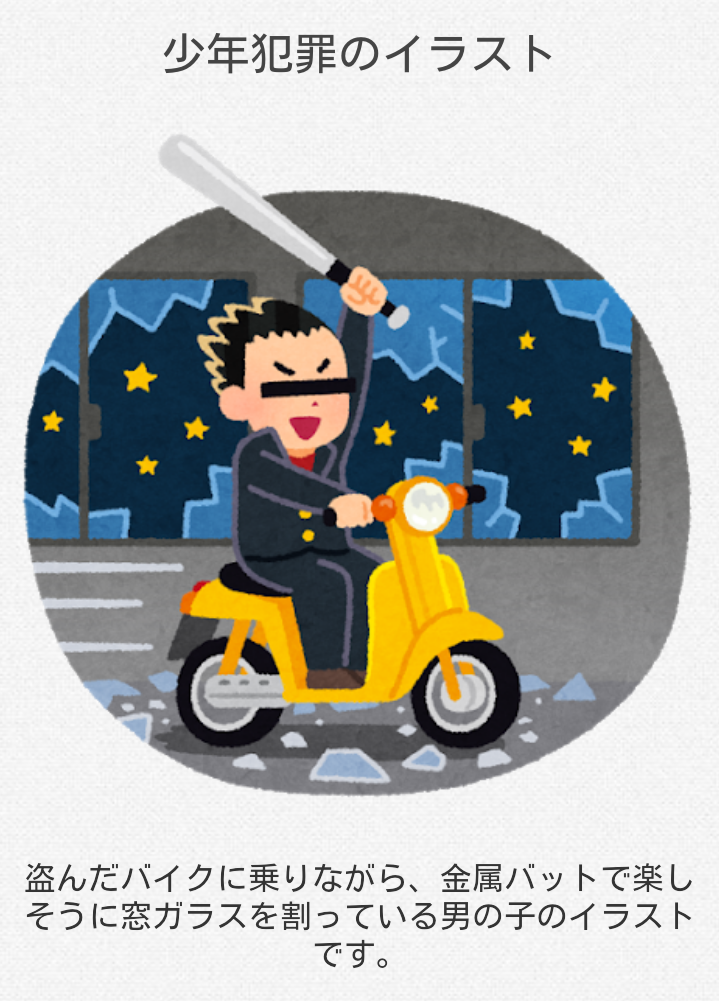 いらすとや「盗んだバイクに乗りながら金属バットで楽しそうに窓ガラスを割っている男の子のイラストです」