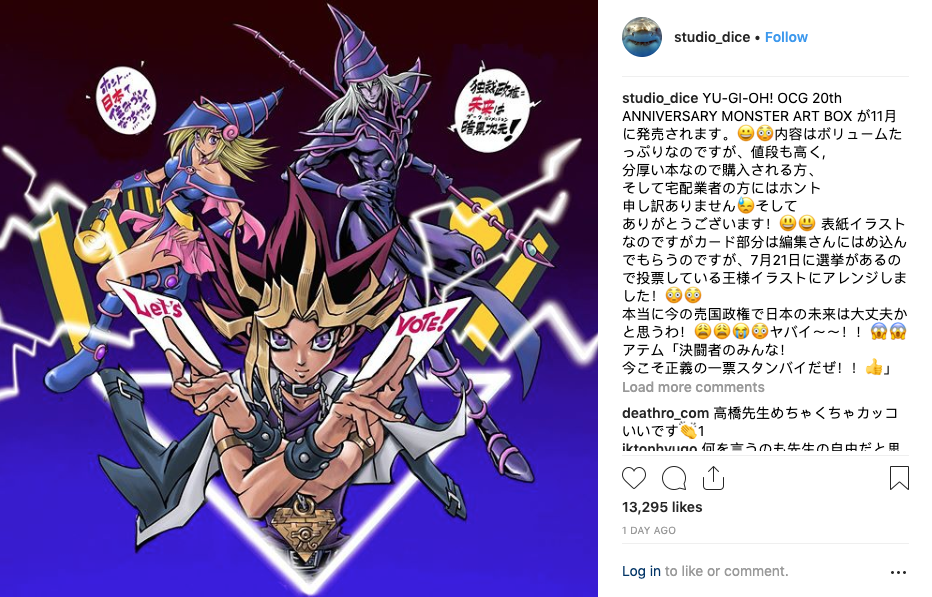 ニメ・ゲーム化されるなど人気の漫画「遊☆戯☆王」シリーズの作者、高橋和希氏が、インスタグラムでの発言で物議をかもし、謝罪した。 高橋さんは15日、制作スタジオ「スタジオダイス」のインスタグラムで「遊☆戯☆王」関連商品の発売日を告知するとともに、同作のキャラクターに「ホント…日本て住みづらくなっちゃった…」「独裁政権に未来は暗黒次元(ダークディメンション)!」などと語らせたそのイラストを公開した。イラストの内容については「7月21日に選挙があるので投票している王様イラストにアレンジしました!」と説明した上で、「本当に今の売国政権で日本の未来は大丈夫かと思うわ! ヤバイ~~!!」とコメントし、「アテム『決闘者のみんな!今こそ正義の一票スタンバイだぜ!!』」と、やはりキャラクターに発言させる形で呼びかけた。 この投稿は賛否を呼び、高橋氏は16日、「なにやらお騒がせしております。いろいろ意見を頂き、キャラクターに政治的表現をさせてしまった事、ファンの皆様に深くお詫び申し上げます」と謝罪したが、当該投稿は削除せずそのまま残している。(日刊スポーツ)