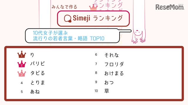 集計期間は7月18日~7月26日。今回のテーマは10代女子が選ぶ「流行りの若者言葉・略語TOP10」。流行りの若者言葉・略語TOP10は、1位が了解を意味する「り」、2位がパーリーピーポー(Party People)の略