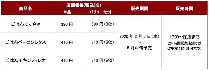 毎日17時から閉店までのディナー時間帯に販売する「夜マック」として「ごはんてりやき」「ごはんベーコンレタス」「ごはんチキンフィレオ」の3つの新しい味が2月5日から楽しめます。