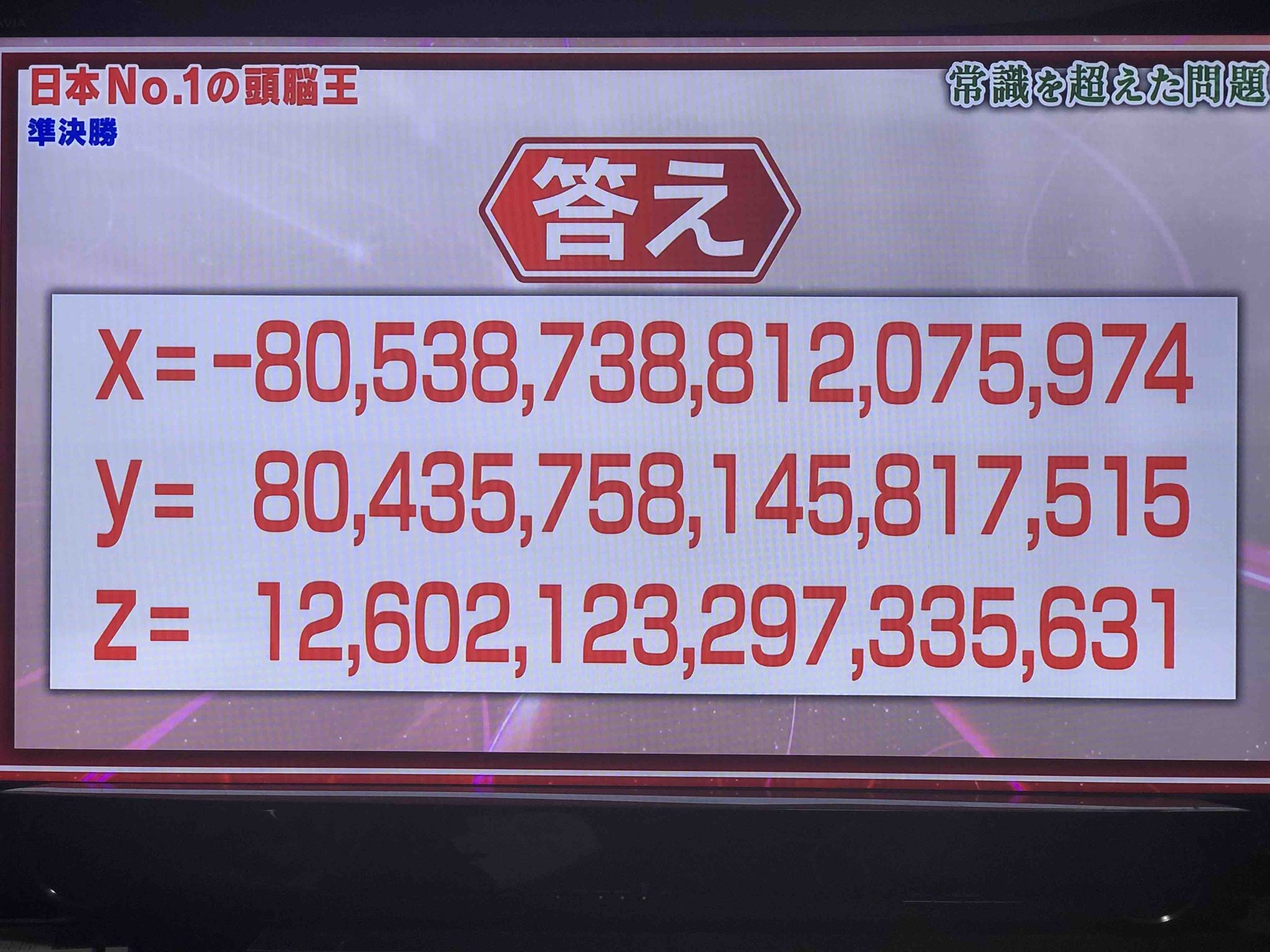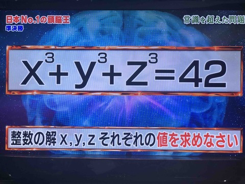 【画像】頭脳王「x^3+y^3+z^3=42を満たす整数解x, y, zを求めよ」【やらせ疑惑】