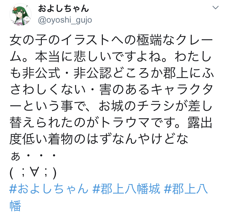 女の子のイラストへの極端なクレーム。本当に悲しいですよね。わたしも非公式・非公認どころか郡上にふさわしくない・害のあるキャラクターという事で、