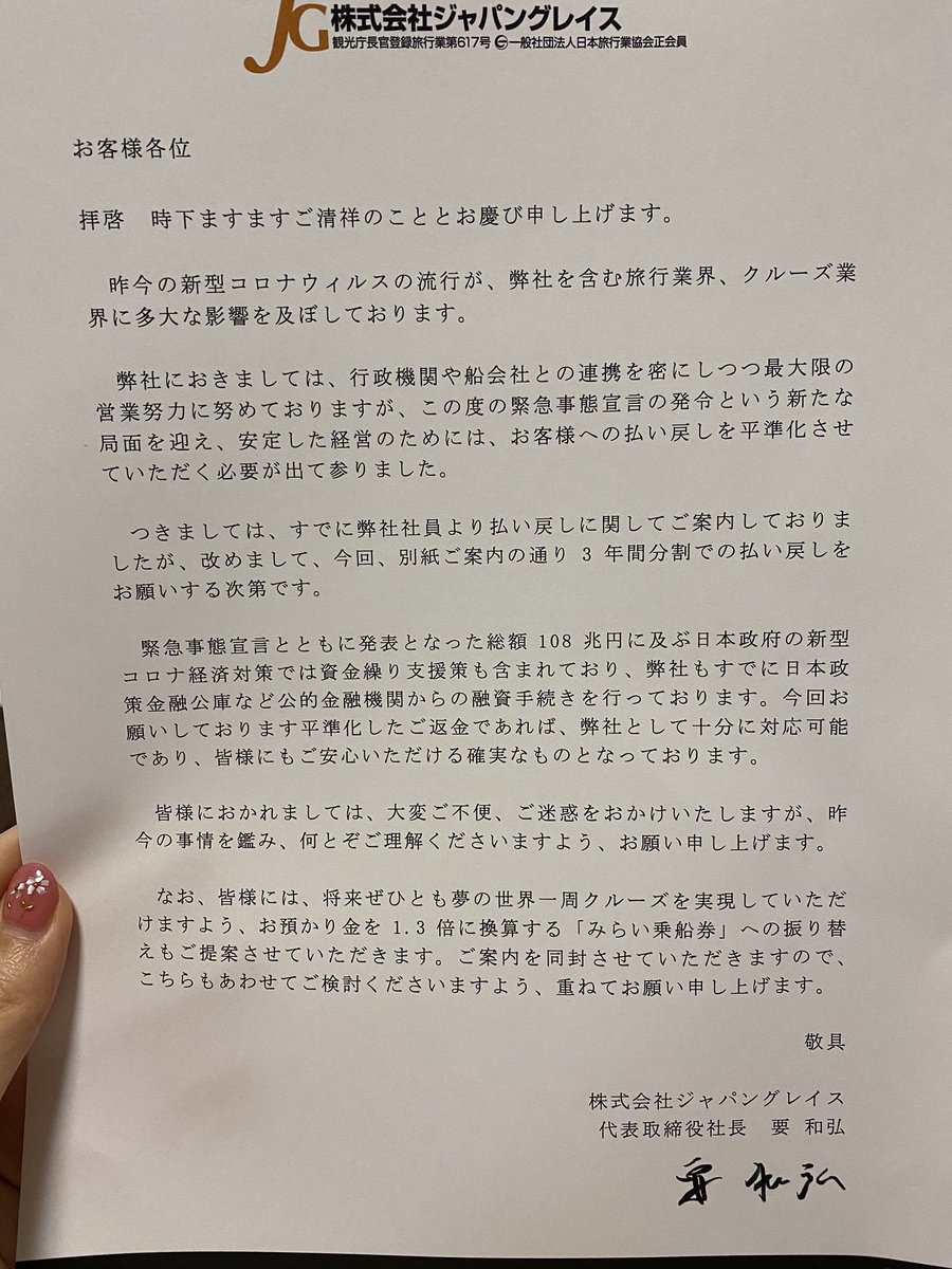 ピースボートさん「クルーズ中止な!200万円を返金しろ?36分割で返したるわ!」