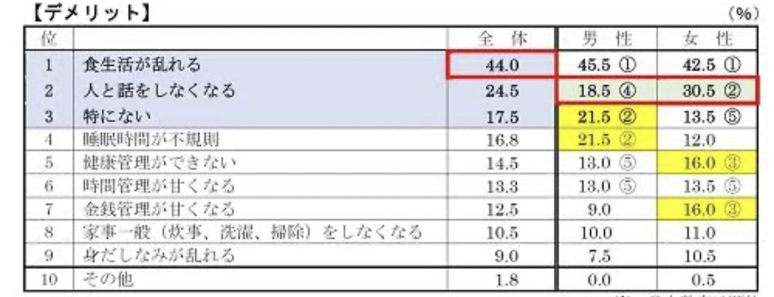 ホーム > ニュースetc > 【悲報】一人暮らし、デメリットしかない 2020/06/04 1: 風吹けば名無し 2020/06/02(火) 08:11:10.92 ID:NVeu+A/90.net 1位 食生活が乱れる 2位 人と話をしなくなる 3位 特にない 4位 睡眠時間が不規則 5位 健康管理ができない 6位 時間管理が甘くなる 7位 金銭管理が甘くなる https://news.mynavi.jp/article/20190118-758252/ 続きを読む Source: 妹はVIPPER - ニュースetc