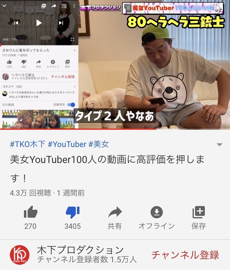 TKO木下さん、自分が可愛いと思う女性YouTuberを勝手に品評会して「いいね」する企画を開催
