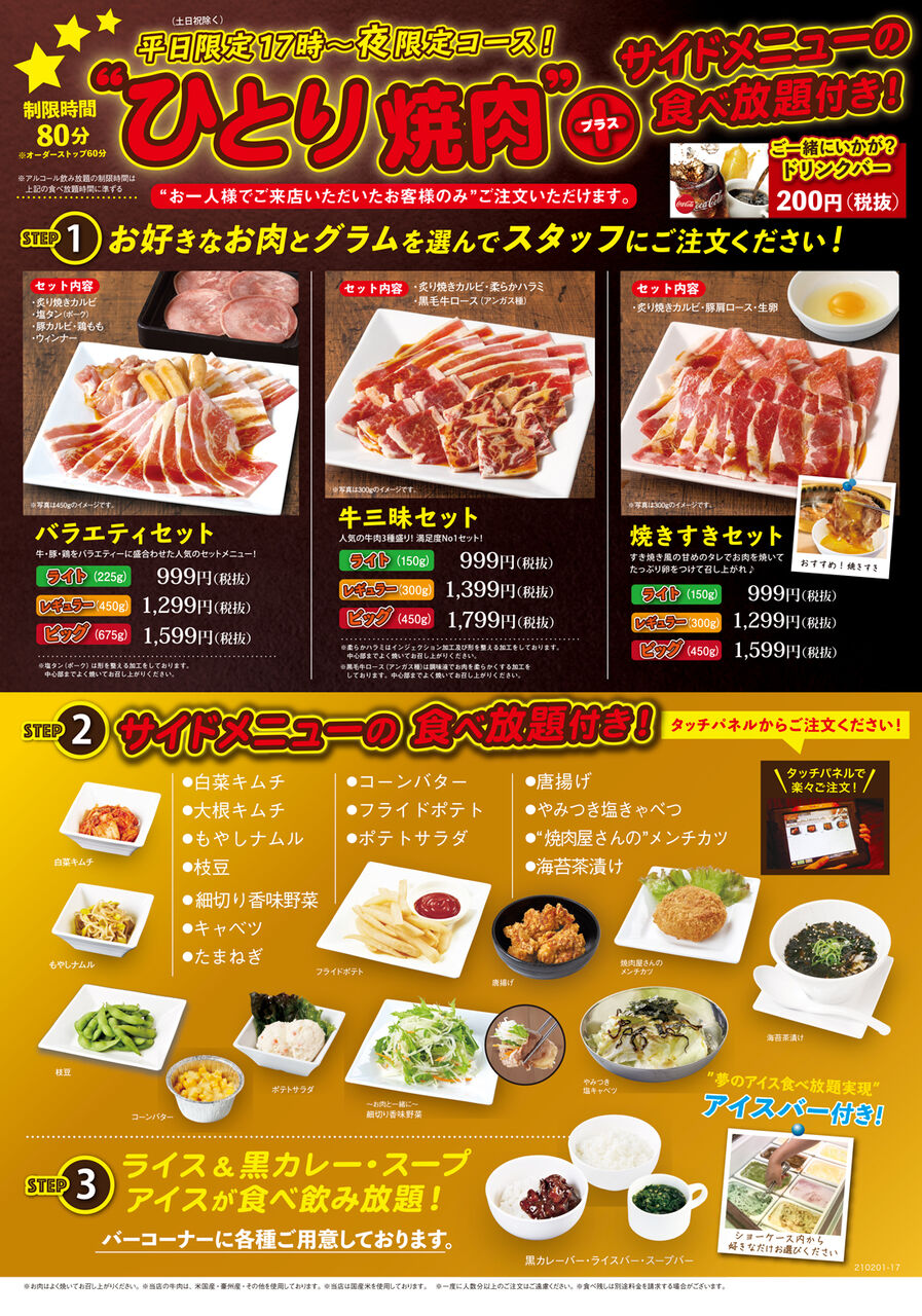 じゅうじゅうカルビでは、安全・安心に焼肉を楽しむことができる「平日夜・おひとり様限定」の“ひとり焼肉”専用メニューが初登場します。■ひとり焼肉+サイドメニュー食べ放題 概要