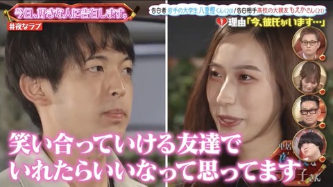 ホーム > ニュースetc > 【悲報】チー牛さん、テレビを利用して告白するも撃沈wwwww (※画像あり) 2021/11/27 1:風吹けば名無し:2021/11/26(金) 15:02:39.50 ID:OSn+dUN1F.net 2:風吹けば名無し:2021/11/26(金) 15:02:58.97 ID:OSn+dUN1F.net なお告白前は自慢気に高一のエピソードを話してた模様 続きを読む Source: ラビット速報 - ニュースetc