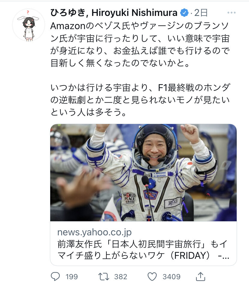 ホーム > ニュースetc > 【悲報】ひろゆき、前澤の宇宙旅行報道にイライラしてしまう 2021/12/19 1: 以下、?ちゃんねるからVIPがお送りします 2021/12/16(木) 16:16:03.024 ID:nFOBYOYGd.net 続きを読む Source: 妹はVIPPER - ニュースetc