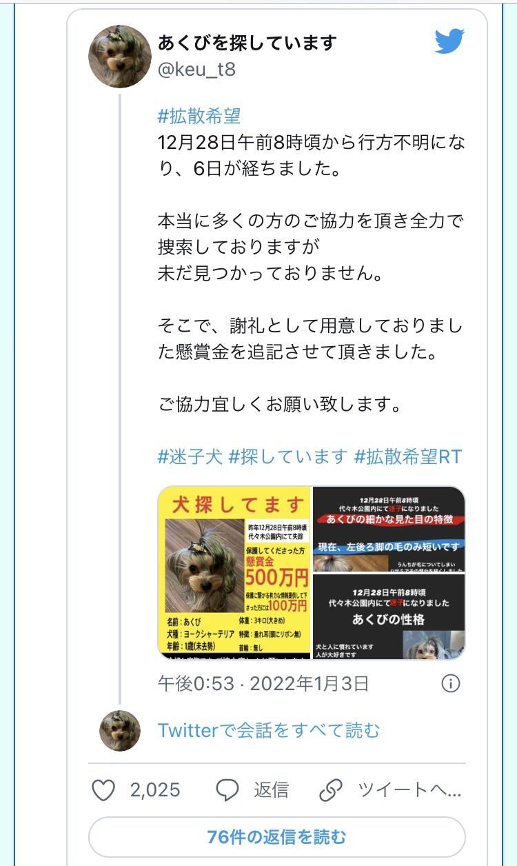 【速報】代々木公園で飼い犬が失踪!見つけたら懸賞金500万円!