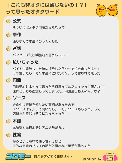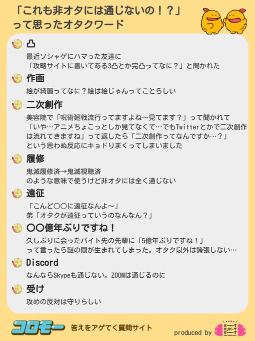 ホーム > ニュースetc > 普通に使ってる?「非オタには伝わらないの!?」と思ったオタクワードwwwwwww 2022/03/23 http://rabitsokuhou.2chblog.jp/images/img/img/adJS/rabitop.js コロモー 「非オタには伝わらないの!?」と思ったオタクワード 12:30 – 2022年03月22日 続きを読む Source: ラビット速報 - ニュースetc