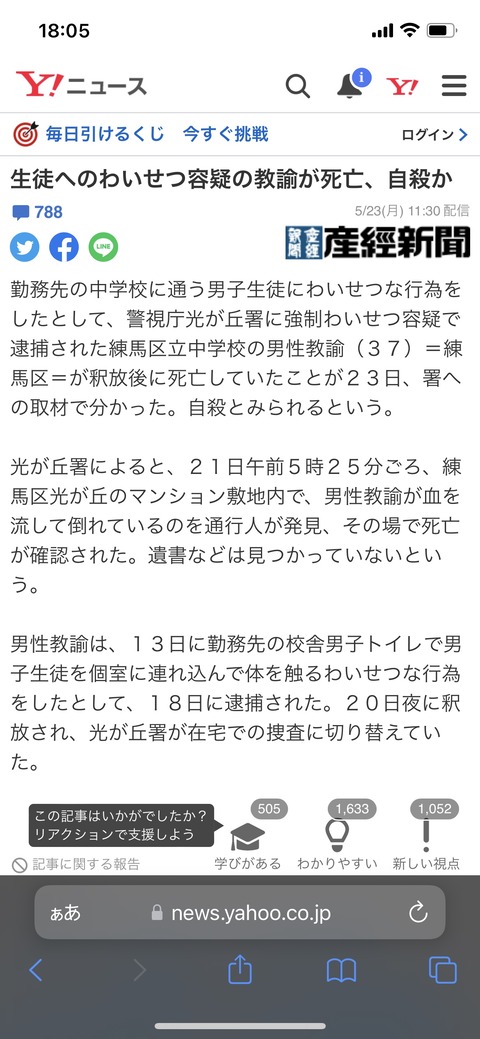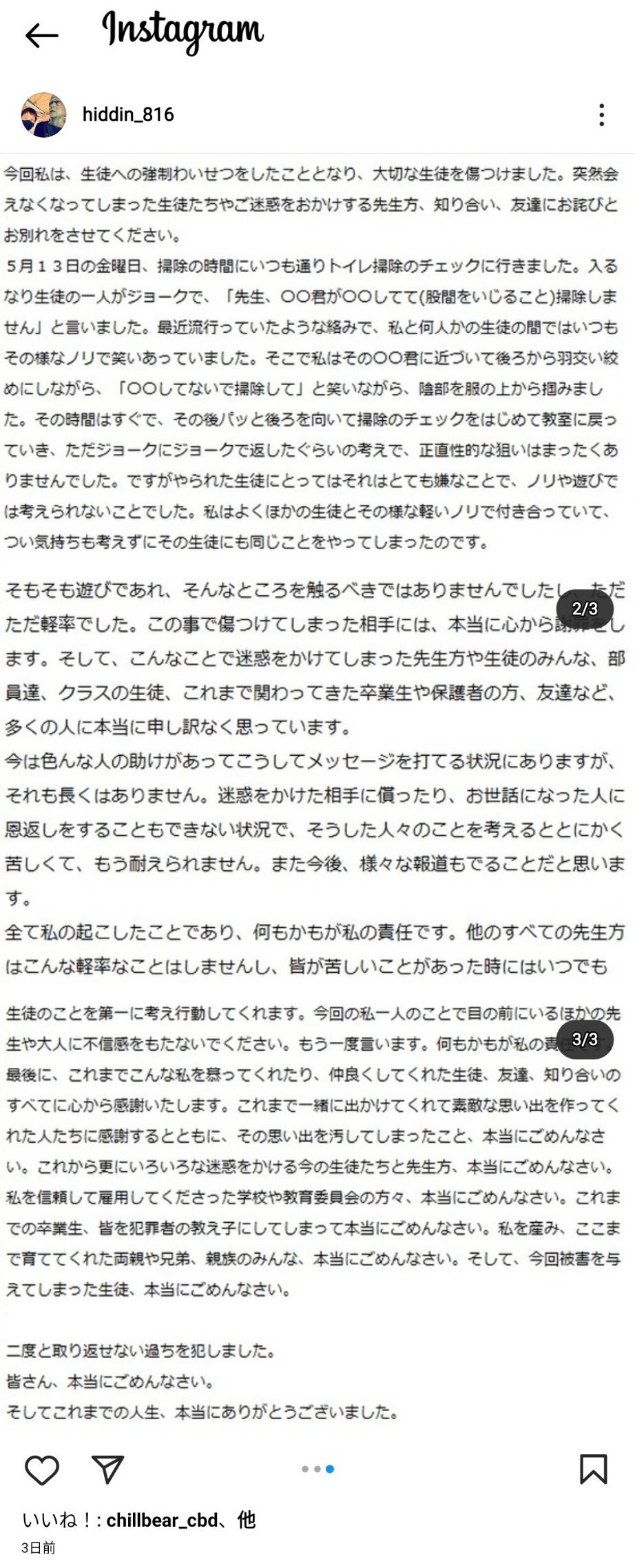 【画像】男子生徒をトイレの個室に押し込んで股間を触り逮捕された男性教諭(37)、インスタに謎の怪文書を残し自殺wwwwwwww