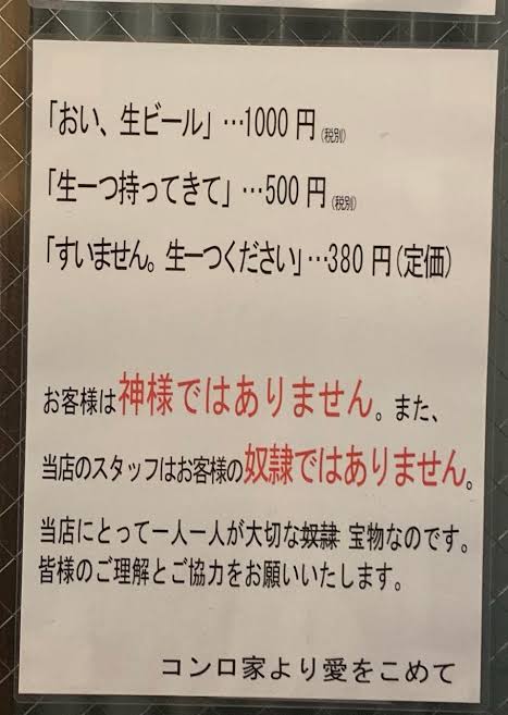 【画像】居酒屋さん「お客様は神様ではありせん」ビールの値段が頼み方で変わると話題に