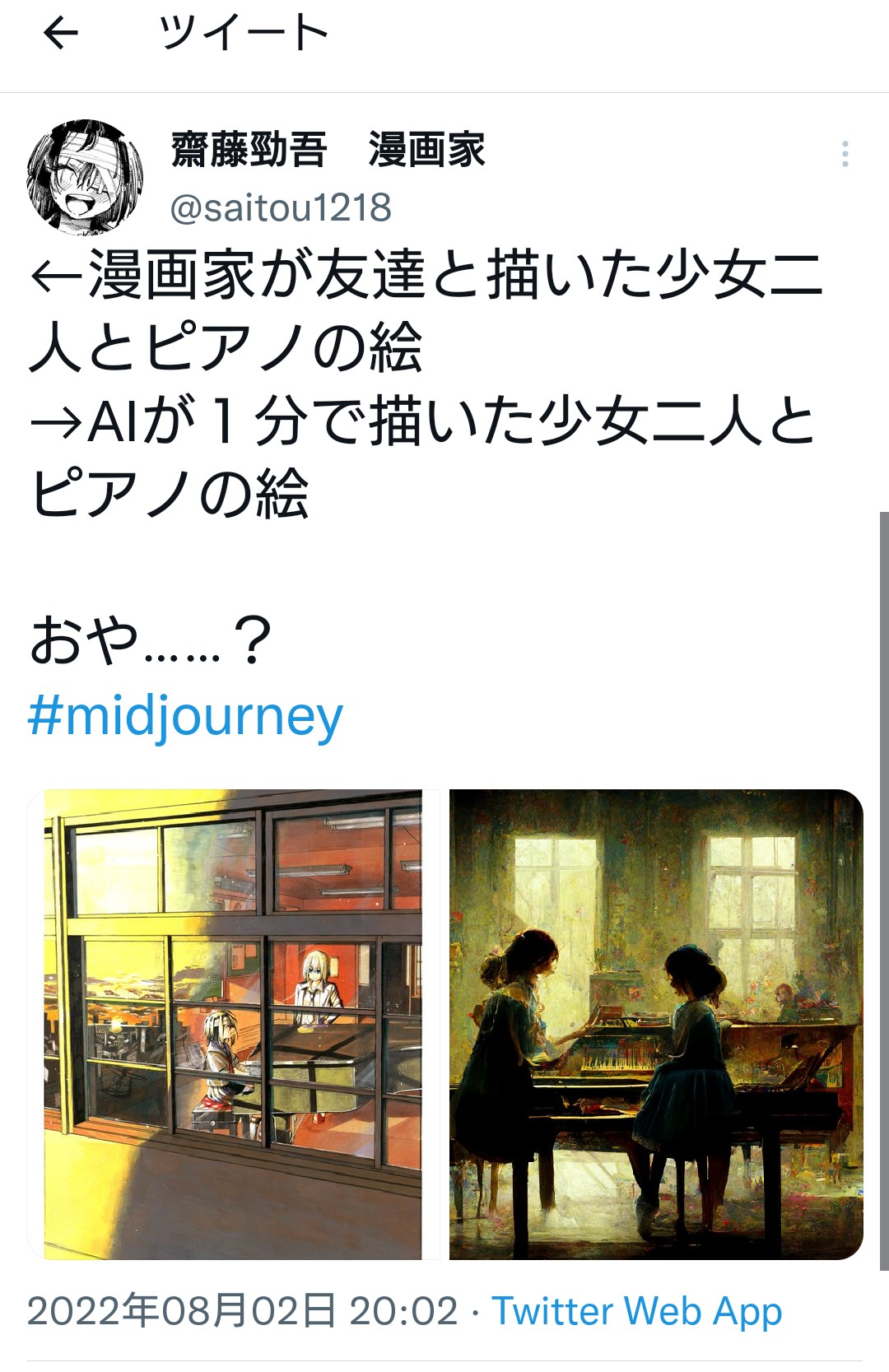 ホーム > ニュースetc > 【悲報】AIさん、本格的にイラストレーターの仕事を奪おうとする (※画像あり) 2022/08/03 1:風吹けば名無し:2022/08/03(水) 08:29:50.58 ID:w1MaizeTr.net もういらないじゃん 2:風吹けば名無し:2022/08/03(水) 08:30:47.71 ID:gkEAiLqC0.net いやまあ似たような作風になるって言う欠点はある 続きを読む Source: ラビット速報 - ニュースetc
