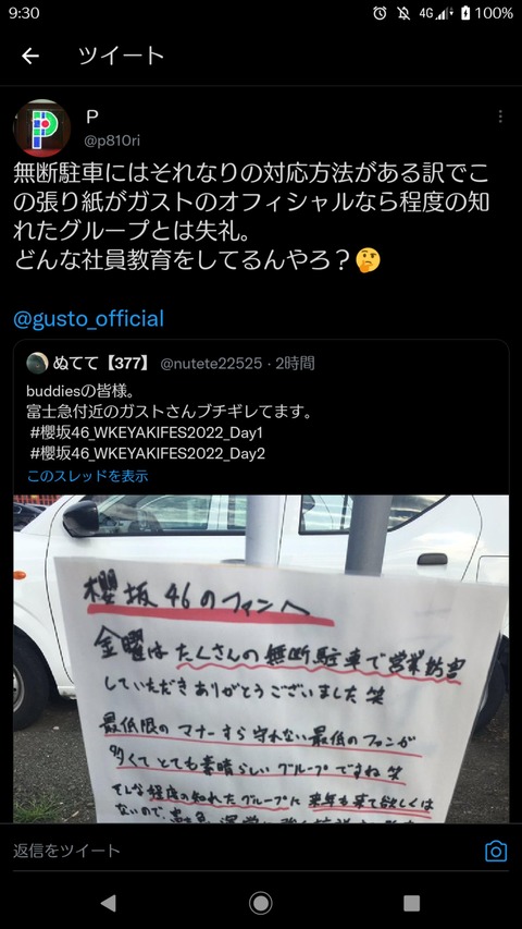 【炎上】櫻坂オタクの無断駐車にガストぶち切れ→オタク逆ギレwwwwwww