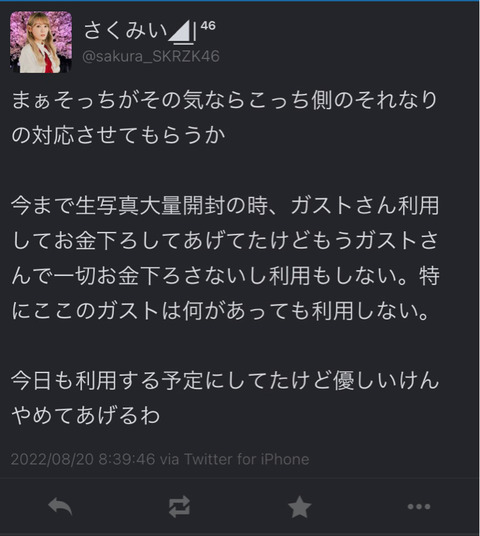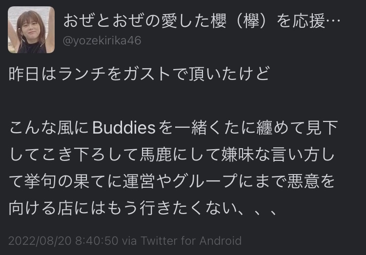 見下してこき下ろして馬鹿にして嫌味な言い方して挙句の果てに運営やグループにまで悪意を向ける店にはもう行きたくない、、、