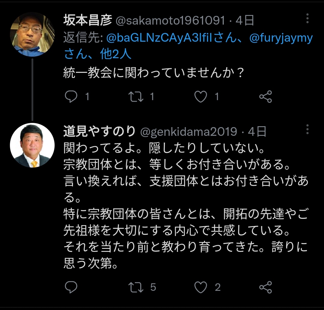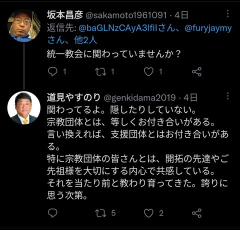 国民黙れの自民党議員さんのTwitter「統一教会と関わってるよ。隠したりしてない」