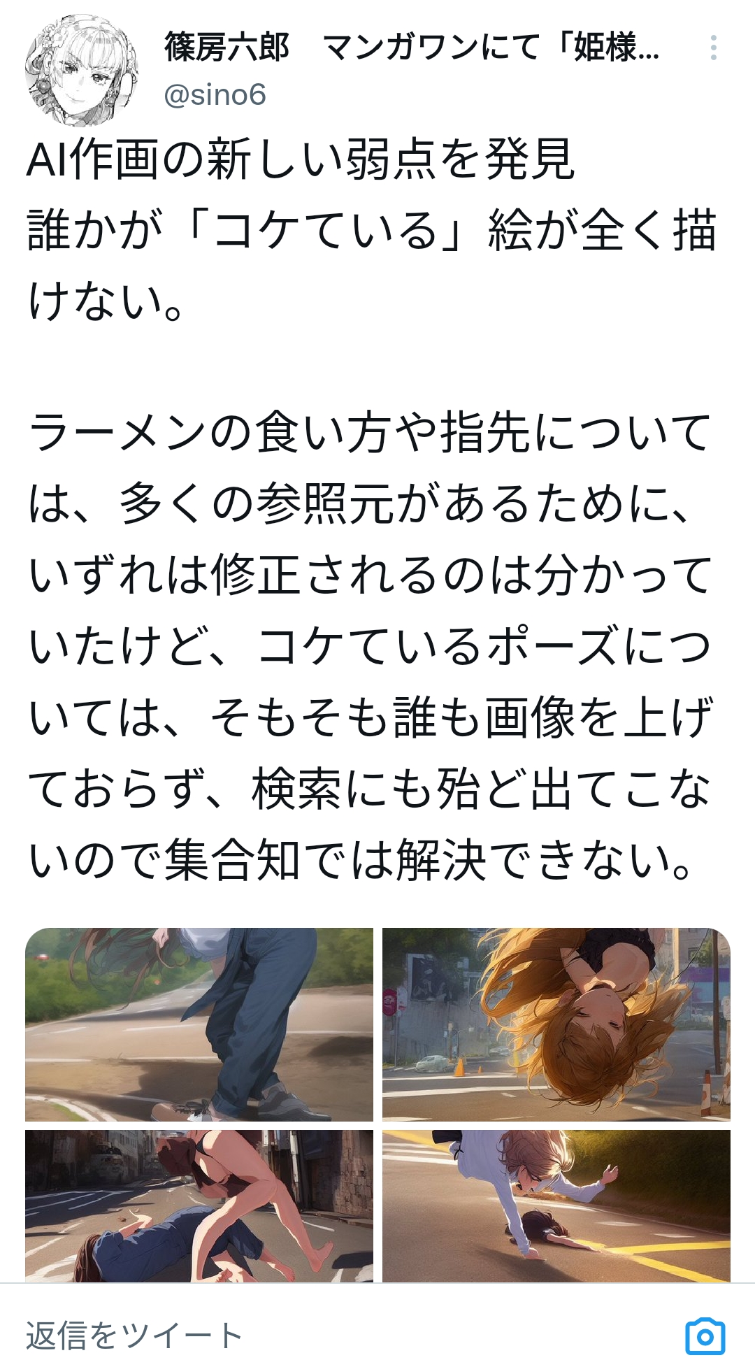 ホーム > ニュースetc > 【画像】漫画家の篠房六郎さんがイラストAIに新たな弱点を発見「コケる絵が描けない」 2023/02/12 1:以下、?ちゃんねるからVIPがお送りします:2023/02/11(土) 18:38:04.066 数カ月後には解決してそう 2:以下、?ちゃんねるからVIPがお送りします:2023/02/11(土) 18:38:44.976 交通事故の瞬間 続きを読む Source: ラビット速報 - ニュースetc