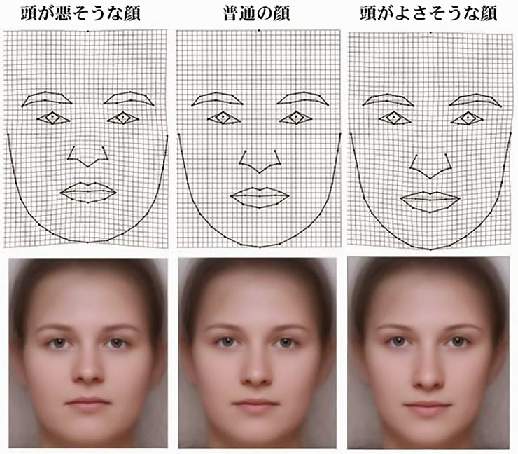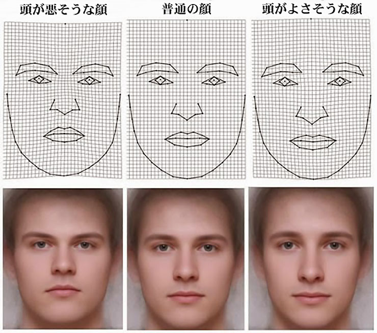 右から「頭が良さそうな顔」「普通の顔」「頭が悪そうな顔」の順にならんでおります。研究者によれば、確かにもともとの顔立ちも重要なんですが、