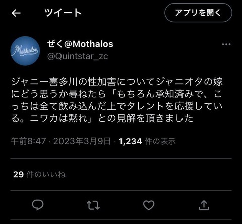 ジャニー喜多川の性加害についてジャニオタの嫁にどう思うか尋ねたら「もちろん承知済みで、こっちは全て飲み込んだ上でタレントを応援している。ニワカは黙れ」との見解を頂きました