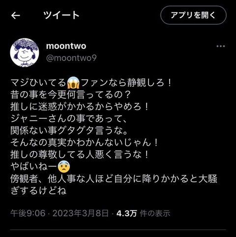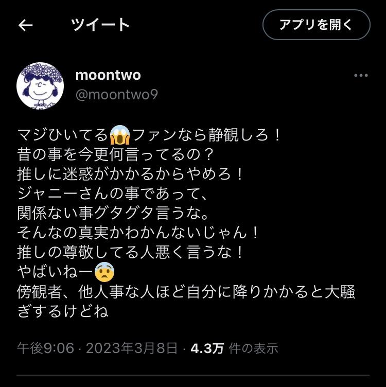 【朗報】ジャニオタ「過去の話だろ!私の推しの活動に迷惑がかかるから騒ぐのやめろ!一般人は黙れ!」