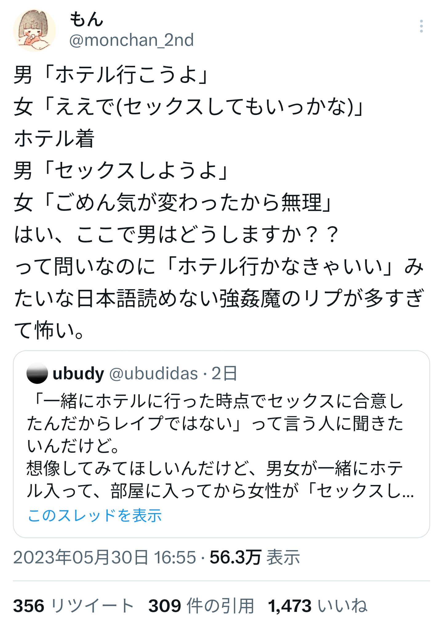 って問いなのに「ホテル行かなきゃいい」みたいな日本語読めない強姦魔のリプが多すぎて怖い。 https://t.co/OoKkaXfurN— もん (@monchan_2nd) May 30, 2023
