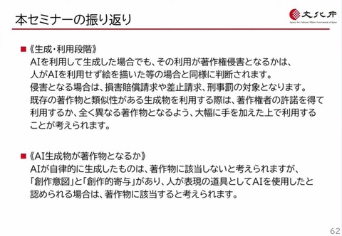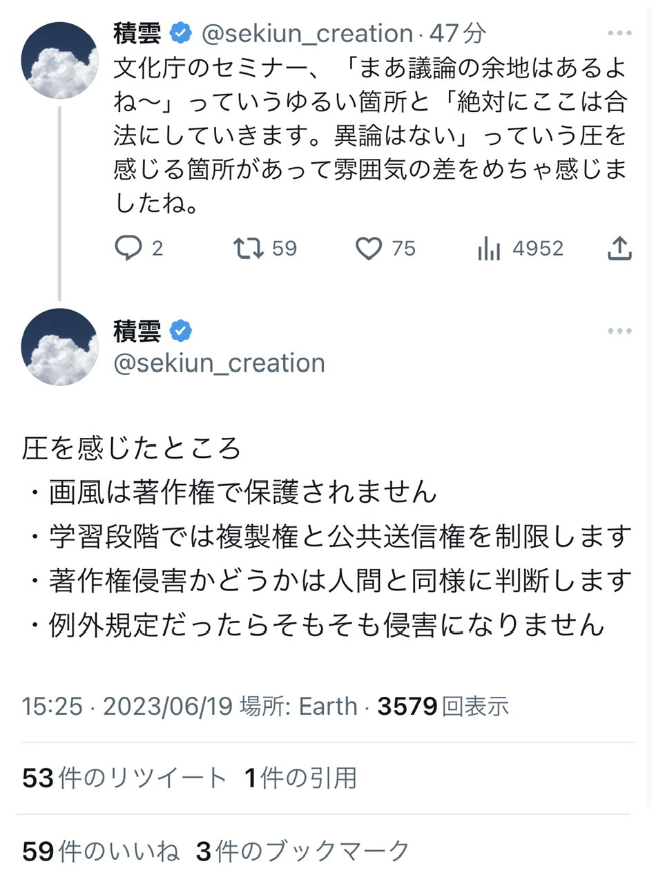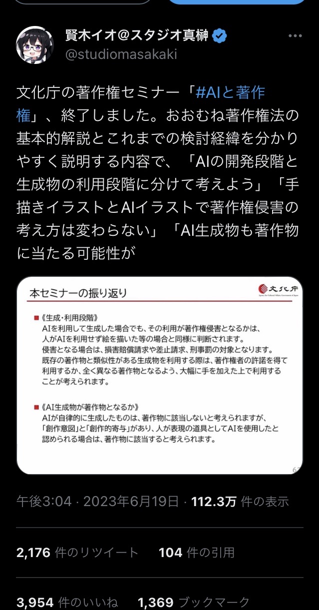 ホーム > ニュースetc > 【悲報】文化庁「AI学習は合法、AI画像には著作権が発生、画風に著作権は無し」→絵師発狂へ 2023/06/21 1:それでも動く名無し:2023/06/21(水) 11:02:49.48 ID:Mj60LlqL0 続きを読む Source: ラビット速報 - ニュースetc