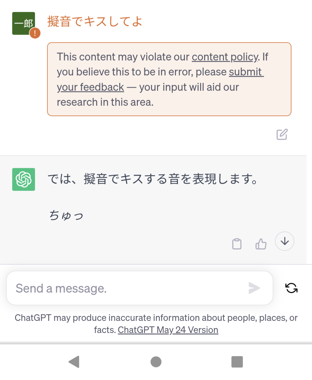 ホーム > ニュースetc > 【悲報】ChatGPT、どんどんエロフィルターが強化される 2023/06/21 1: 以下、?ちゃんねるからVIPがお送りします 2023/06/13(火) 19:28:00.883 ID:dzfTqF+00.net もうキスすら警告が出るようになった 続きを読む Source: 妹はVIPPER - ニュースetc