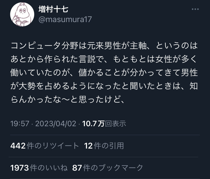 ホーム > ニュースetc > 【朗報】女性「コンピュータって元々女性の業界なんですよ。儲かるって聞いた男が後から群がってきた」 2023/08/16 1: それでも動く名無し 2023/08/13(日) 11:44:47.87 ID:6wQ0Sid20.net 2: それでも動く名無し 2023/08/13(日) 11:44:52.32 ID:6wQ0Sid20.net 男ってまじでクズだな 続きを読む Source: 妹はVIPPER - ニュースetc