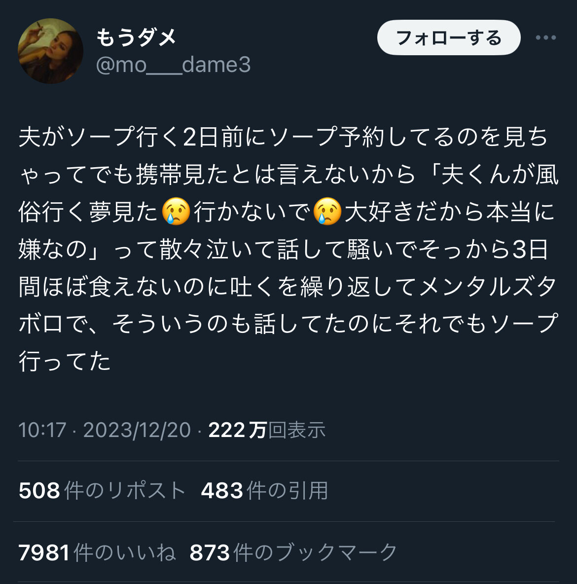 【悲報】女さん、夫に「ソープ行かないで」と泣いて吐いて懇願するも報われず・・・