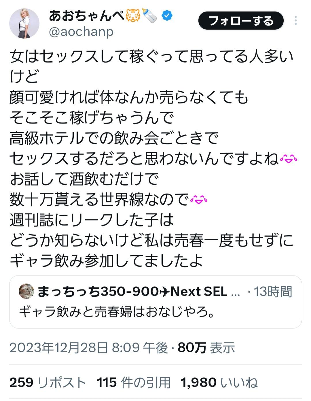 ホーム > ニュースetc > 【画像】まんさん『女はセックスして稼いでるって思ってる人へ』 2023/12/29 1: 2023/12/29(金) 10:00:39.31 ID:R1TbRQPn0.net ええなあ 3: 2023/12/29(金) 10:01:31.83 ID:gOCJRnK00.net でもセックスして稼ぐのは簡単やん 続きを読む Source: 妹はVIPPER - ニュースetc