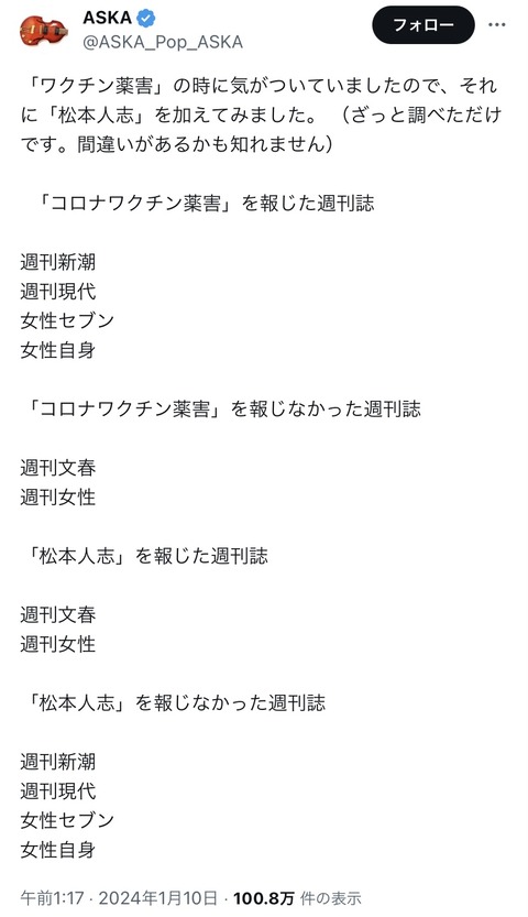 ホーム > ニュースetc > 松本人志騒動、ASKAが新たな視点から参戦wwwwwwwwww 2024/01/10 1:それでも動く名無し:2024/01/10(水) 10:31:28.75 ID:UD0ieJ0Hd 2:それでも動く名無し:2024/01/10(水) 10:32:19.18 ID:I+BEoImN0 あっ… 3:それでも動く名無し:2024/01/10(水) 10:32:36.79 ID:kMj+W4Sy0 この人はおもろいから許す 続きを読む Source: ラビット速報 - ニュースetc