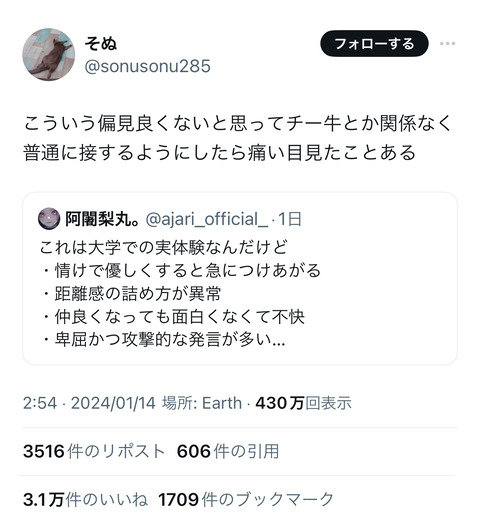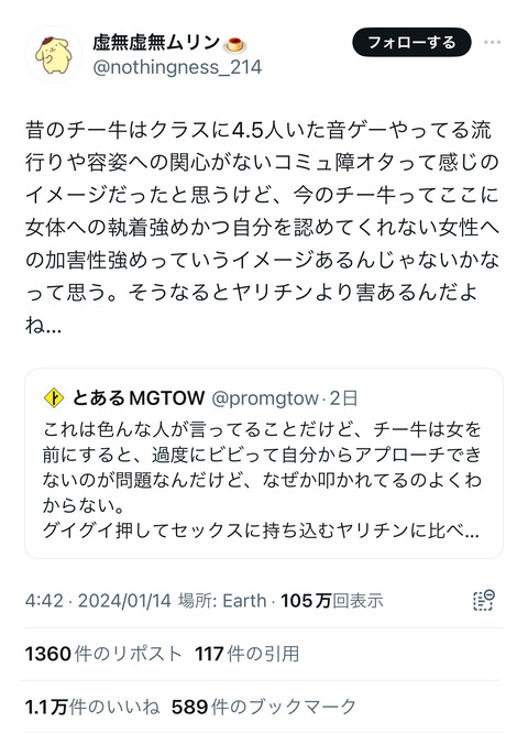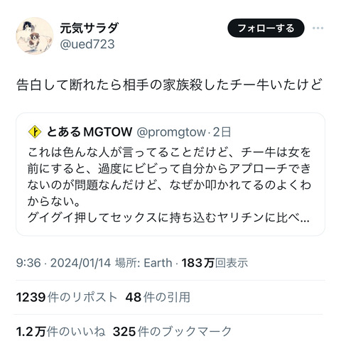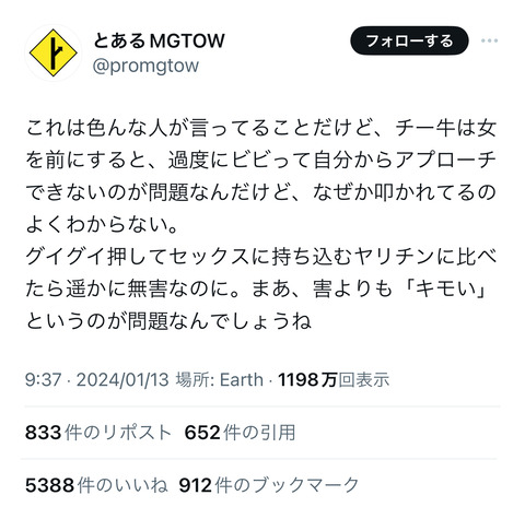 ホーム > ニュースetc > 【悲報】チー牛「ぼくたち女に迷惑かけてなくない?」女性「いいえ、チー牛は存在が公害です」 2024/01/15 1:それでも動く名無し:2024/01/15(月) 10:13:26.16 ID:uYriQ+a90 ↓ 2:それでも動く名無し:2024/01/15(月) 10:15:03.22 ID:KO83SPRn0 すき家もそろそろキレてええやろ 続きを読む Source: ラビット速報 - ニュースetc
