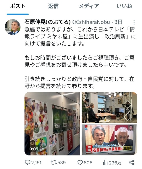 【悲報】石原伸晃、炎上wwwwwwwwwww