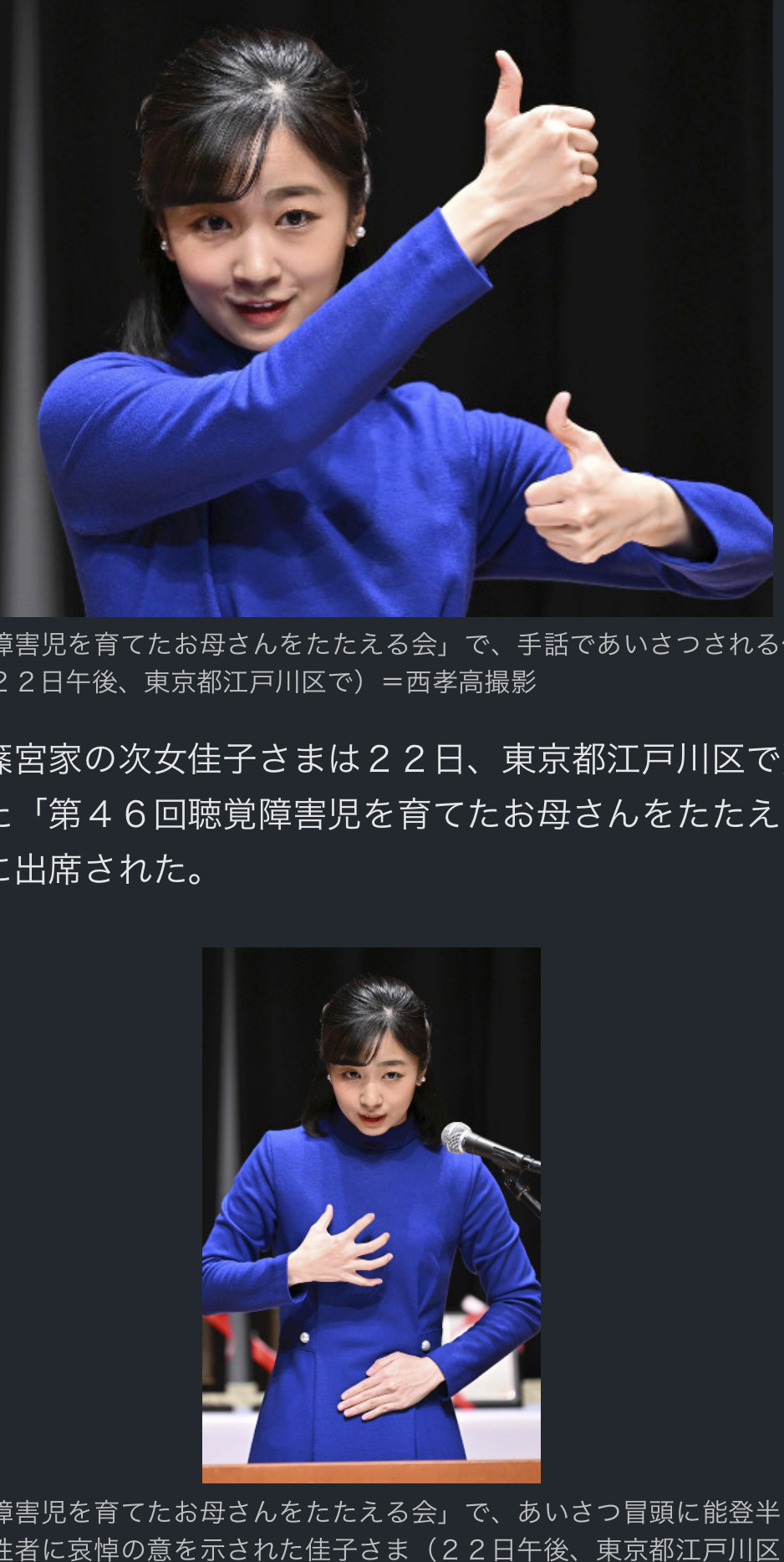 佳子さま、地震犠牲者に哀悼の意…手話で「誰もが安心して暮らせる社会に」あいさつの冒頭、佳子さまは手話を交えて能登半島地震で亡くなった人々に哀悼の意を表し、「困難な中におられる方々のことを思うと胸が痛みます」と述べられた。その上で、「誰もが安心して暮らせる社会になることを願います」と手話で伝えられた。