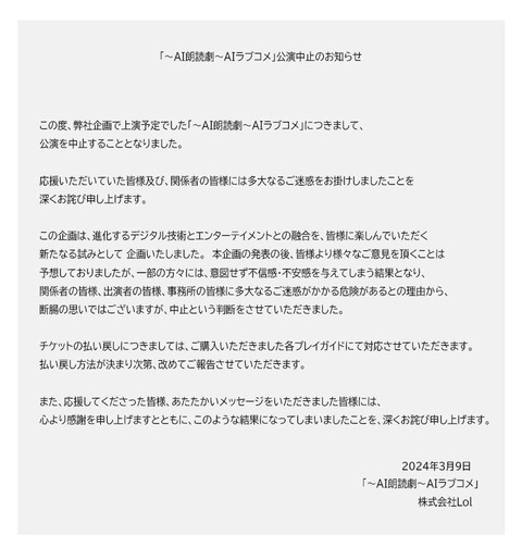 公演を予定しておりました「~AI朗読劇~ AIラブコメ」について大切なご報告がございます