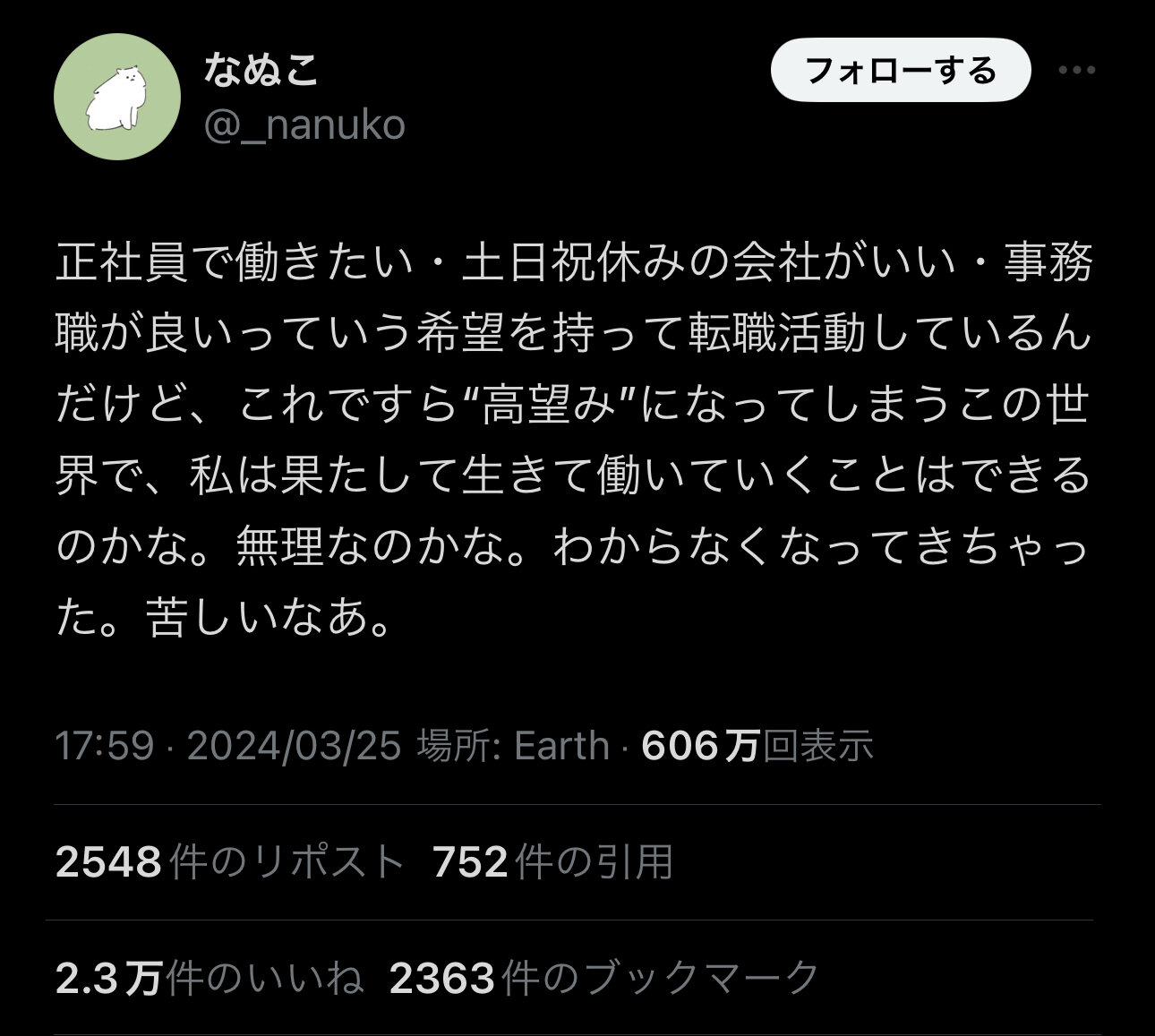 ホーム > ニュースetc > 【悲報】20代女子、泣く「正社員で土日祝休みの事務職に就きたいのすら高望み扱いされる。苦しい」 2024/03/26 1: 2024/03/26(火) 16:45:26.77 ID:GrIXcp5Y0.net 3: 2024/03/26(火) 16:46:28.43 ID:2Ztz+pvfd.net で、学歴は? 続きを読む Source: 妹はVIPPER - ニュースetc