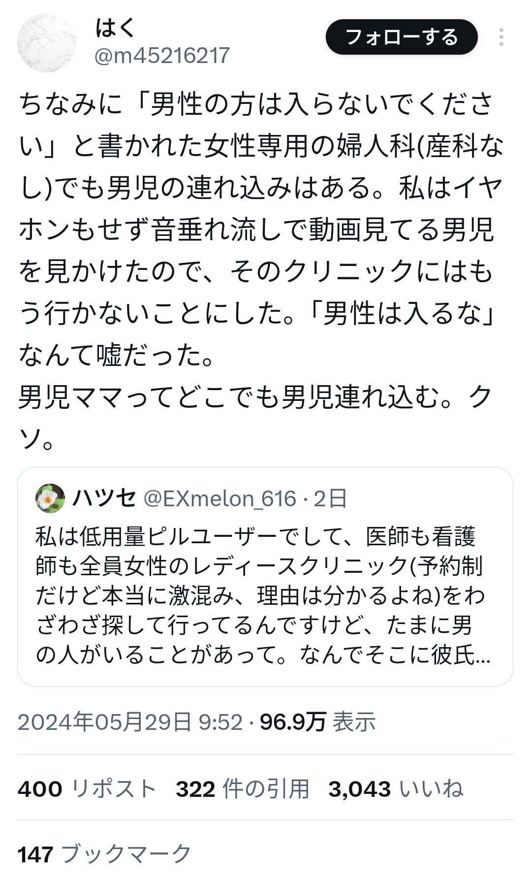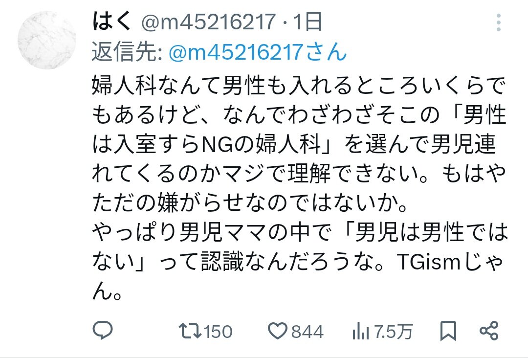 ホーム > ニュースetc > 女性さん「男性お断りの婦人科に男児が居たんだけど!!💢💢😡😡😡」 2024/05/31 1: 以下、?ちゃんねるからVIPがお送りします 2024/05/31(金) 09:51:27.899 ID:qpaoL7YT0.net 婦人科より先に行ったほうがいい病院ありそう😅 4: 以下、?ちゃんねるからVIPがお送りします 2024/05/31(金) 09:54:25.706 ID:tWAZpfEz0.net 女の敵は女 続きを読む Source: 妹はVIPPER - ニュースetc