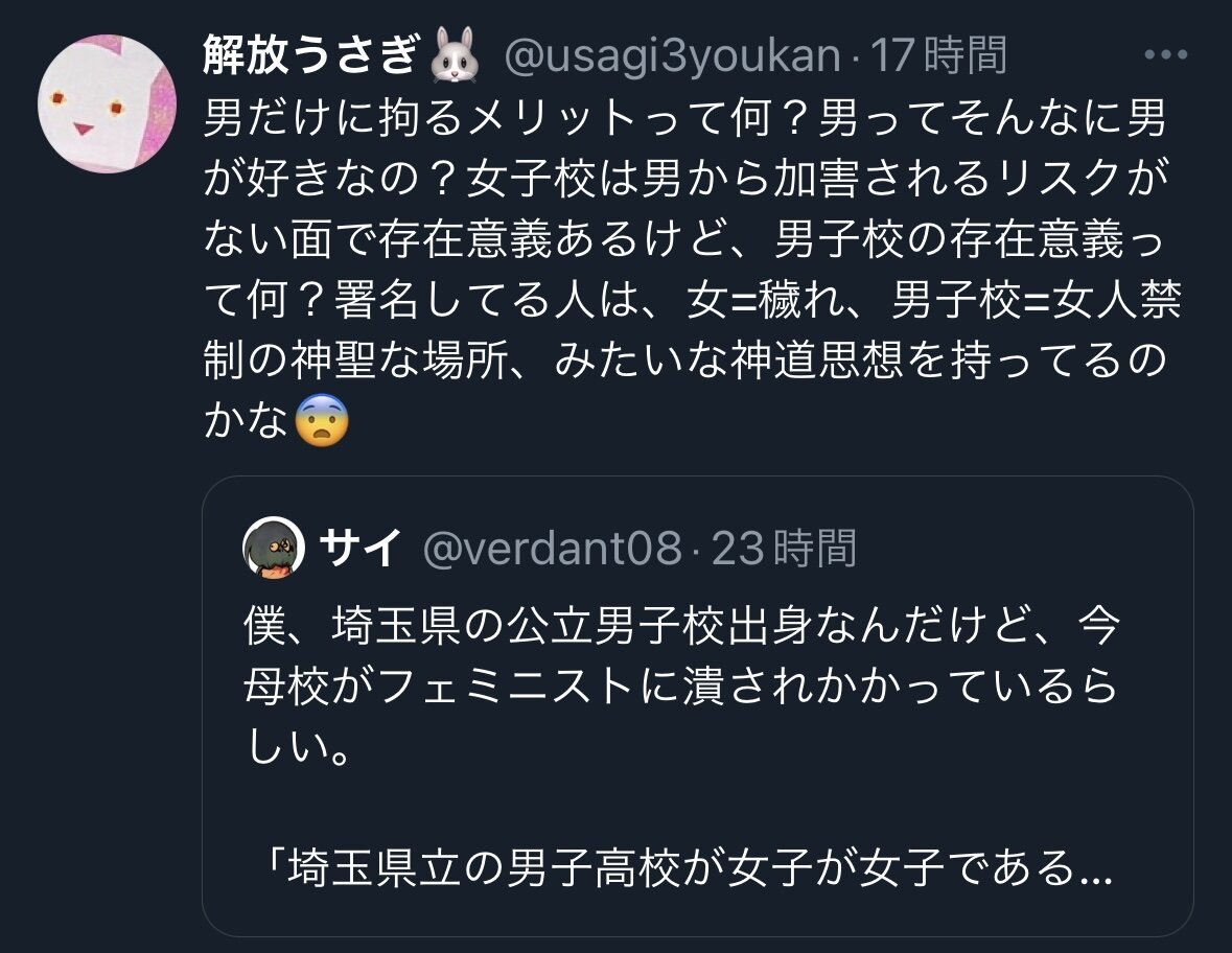 ホーム > ニュースetc > 【正論】女性「女子校は必要だけど男子校はいらねーだろ」 2024/08/14 1: 以下、?ちゃんねるからVIPがお送りします 2024/08/09(金) 16:33:47.482 ID:DvaMgvbJ0.net 2: 以下、?ちゃんねるからVIPがお送りします 2024/08/09(金) 16:35:04.540 ID:J081RHI20.net ホモのために必要 続きを読む Source: 妹はVIPPER - ニュースetc