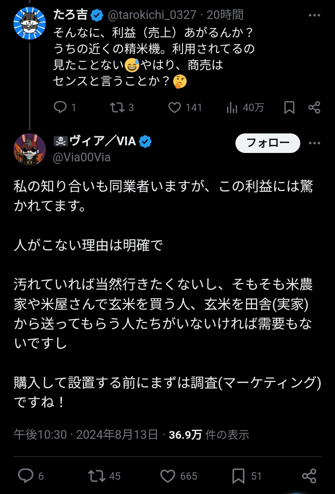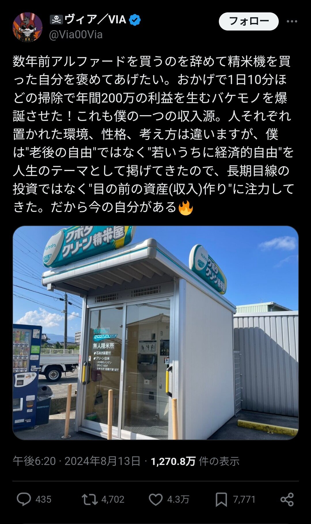 ホーム > ニュースetc > 【悲報】有識者「アルファードを買うやつは馬鹿。賢者は精米機を買います」 2024/08/18 1: それでも動く名無し 警備員[Lv.7] 2024/08/15(木) 01:13:41.52 ID:ILKLrTku0.net なるほどな 2: それでも動く名無し ころころ 2024/08/15(木) 01:14:13.85 ID:ILKLrTku0.net なんでそんな好立地のところに精米機が無かったんやろ 続きを読む Source: 妹はVIPPER - ニュースetc