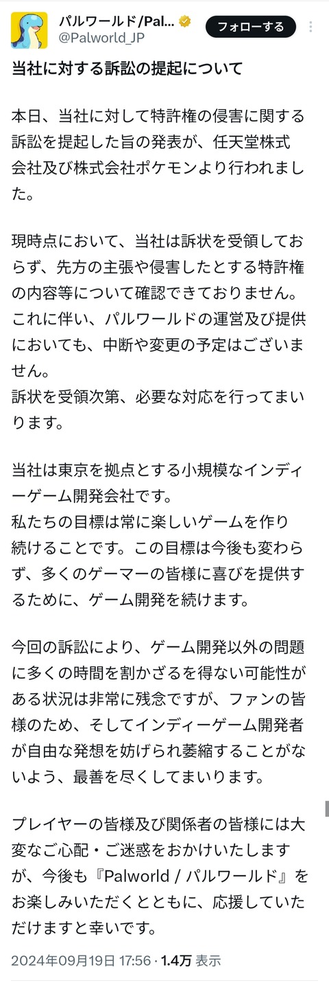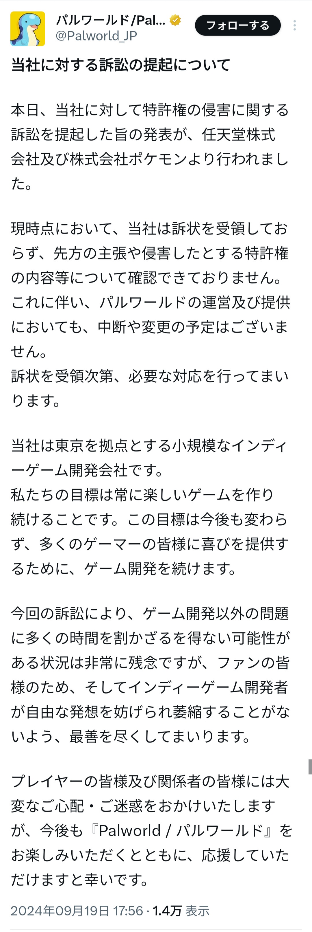 【画像】パルワールド、徹底抗戦の構えwwwwwwwwww
