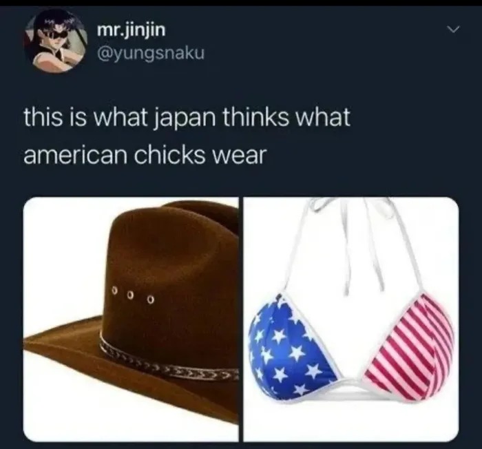 ホーム > ニュースetc > 海外「日本はアメリカ人女性がこれを身に着けてると思ってる」 2024/10/17 スレッド「これが日本が考えるアメリカ人女性が身に付けてるものだ」より。引用:Reddit、9gag、Twitter (海外の反応) 1万国アノニマスさん これが日本が考えるアメリカ人女性が身に付けてるものだ 2万国アノニマスさん 本当だったらどんなによかったか 3万国アノニマスさん え、身に付けてないの?🙁 続きを読む Source: 海外の万国反応記 - ニュースetc