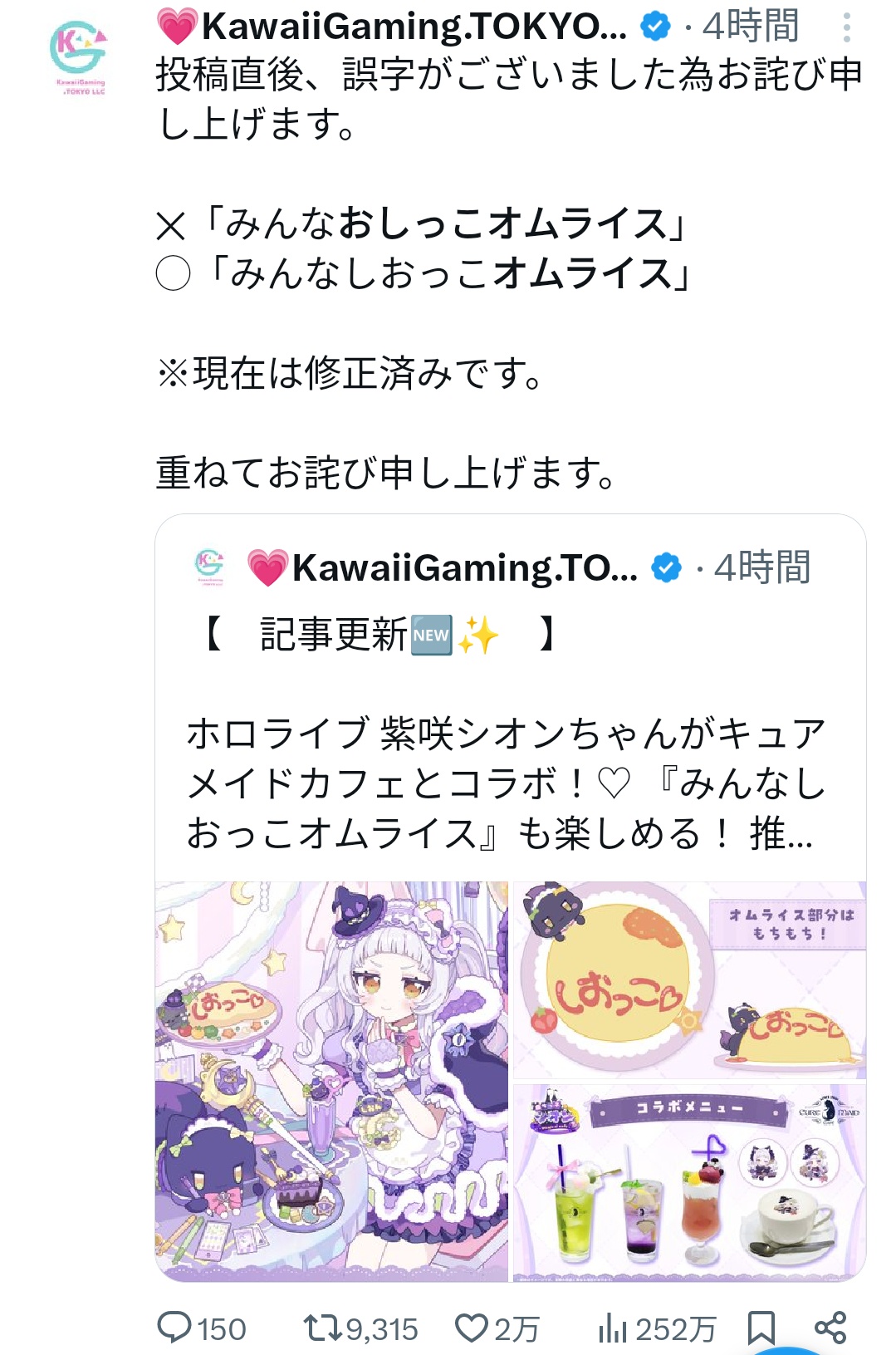 【画像】VTuberさん、コラボカフェで「おしっこオムライス」の販売を告知するも誤字だと判明して炎上wwwwwwwwww