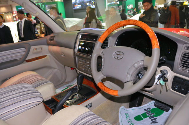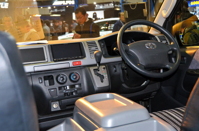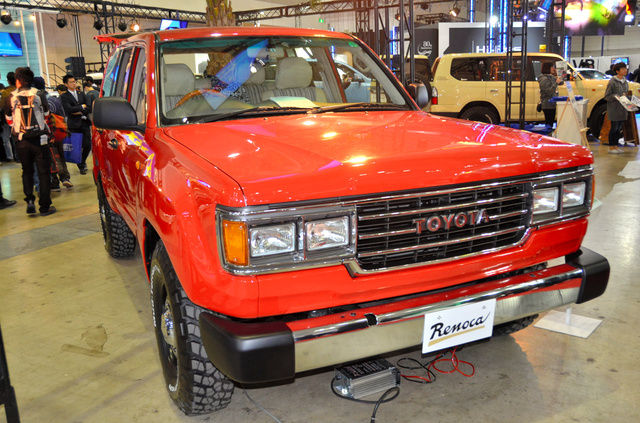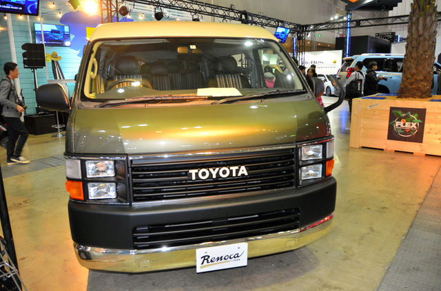 中古車販売会社「フレックス」(東京都港区)が出展したのは、トヨタ自動車のクロスカントリー(クロカン)車「ランドクルーザー(ランクル)」やワンボックス車「ハイエース」といったレジャー用途に人気の車両を、70~80年代のアメリカンな雰囲気に仕立てたモデル。住宅リフォームのような感覚で中古車を新車のように仕立てる「リノベーションカー」だ。