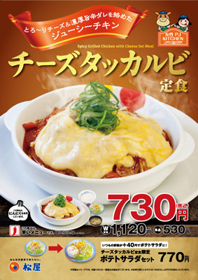 松屋は1月23日、「チーズタッカルビ定食」(税込730円)を発売する。濃厚なチーズの帽子を被ったチーズタッカルビ定食は、松屋の女性社員考案の新メニュー。