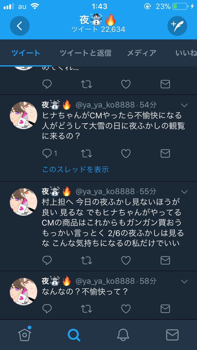 村上担へ 今日の夜ふかし見ないほうが良い 見るな でもヒナちゃんがやってるCMの商品はこれからもガンガン買おう もっかい言っとく 2/6の夜ふかしは見るな こんな気持ちになるの私だけでいい