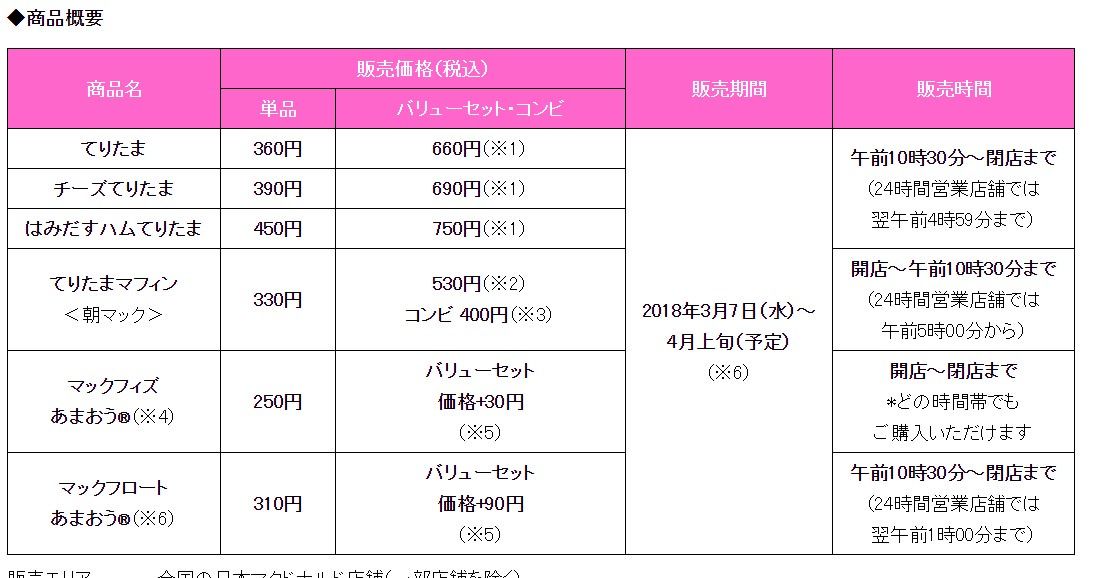 さらに「マックフィズ あまおう®」/「マックフロート あまおう®」も同時販売いたします。1996年の初登場以来、20年を超えて愛され続けている「てりたま」は、しょうがとリンゴ、隠し味ににんにくの風味を加えた甘辛いてりやきソースを絡めたポークパティと、ぷるぷるたまごが特長の商品です。