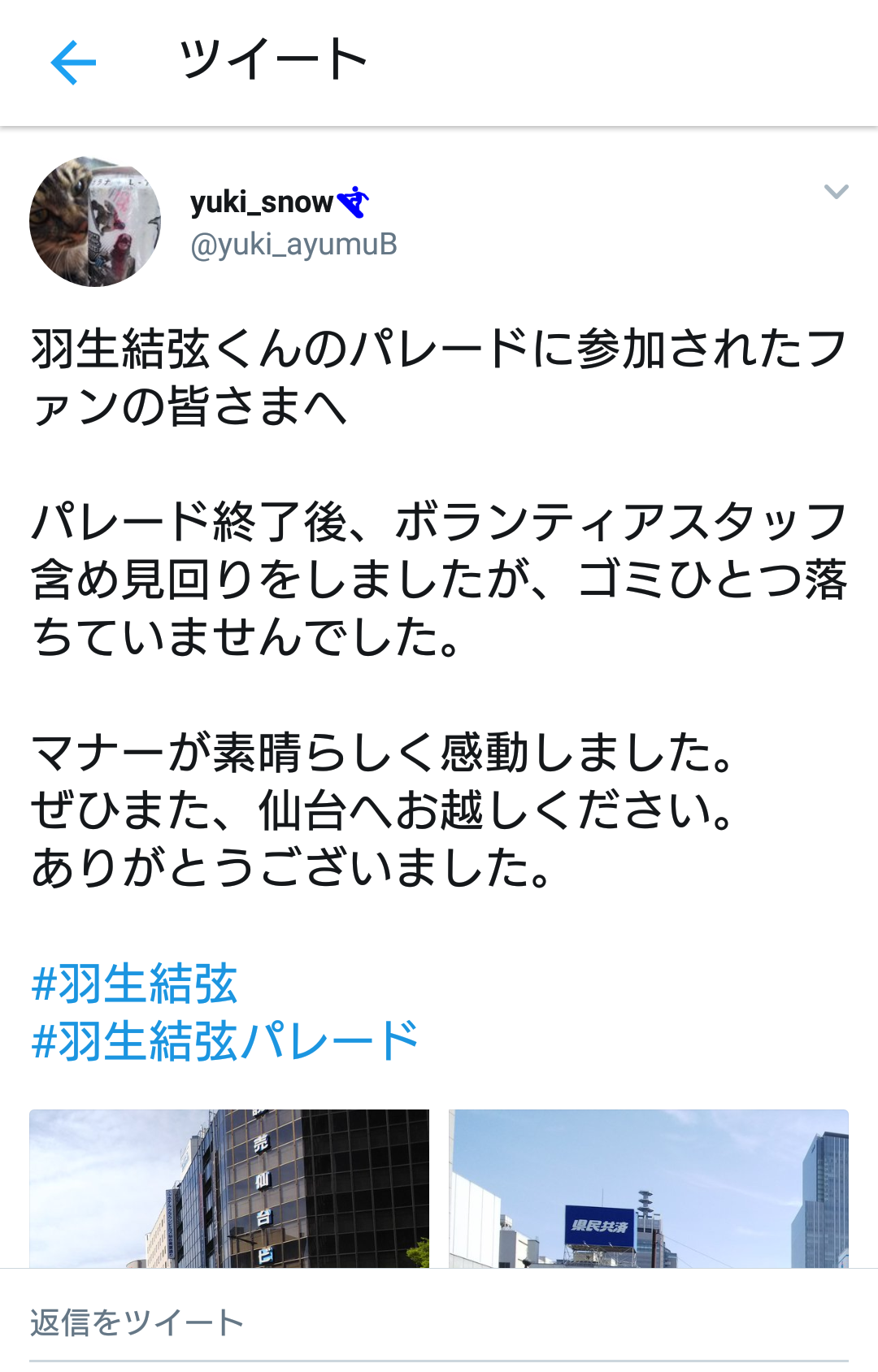 ありがとうございました。#羽生結弦#羽生結弦パレード pic.twitter.com/7aH7bEHhTa— yuki_snow🏂 (@yuki_ayumuB) 2018年4月22日