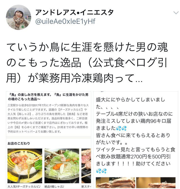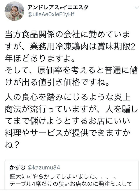 ホーム > ニュースetc > 「誤発注で鶏肉96キロ届きました。500円引きするので助けて下さい」ツイ民「儲けが出る値引きですね」 2018/05/29 1:風吹けば名無し:2018/05/29(火) 12:50:33.49 ID:ihZjisnP0NIKU.net 続きを読む Source: ラビット速報 - ニュースetc